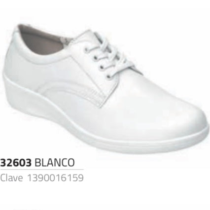 Casual shoe in white cowhide suitable for service and/or clinical use. Adjustment with laces. Rounded toe. Clear cut, textile lining and natural pigskin insole. White sole with Best Grip System technology. Lightweight wedge for comfort.