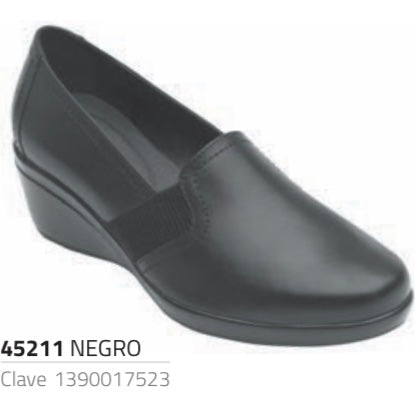 Classic black leather comfort shoe with rounded toe. Its 5.3cm high gloss wedge is recommended by all specialists as the optimal height for the foot. Elastic sides for better fit and decoration. Insole lined with natural pigskin that provides freshness. So comfortable and versatile you won't want anything else.